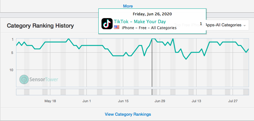 据Sensor Tower数据,截至6月30日的初步估计和预测显示,到2020年上半年,全球消费者在苹果App Store和Google Play上总共花费了501亿美元。其中TikTok以4.21亿美元收入名列全球第三,仅次于Tinder与YouTube。仅在2020年上半年,TikTok的安装量就达到6.26亿次。TikTok已经是下载量排名第一非游戏应用。