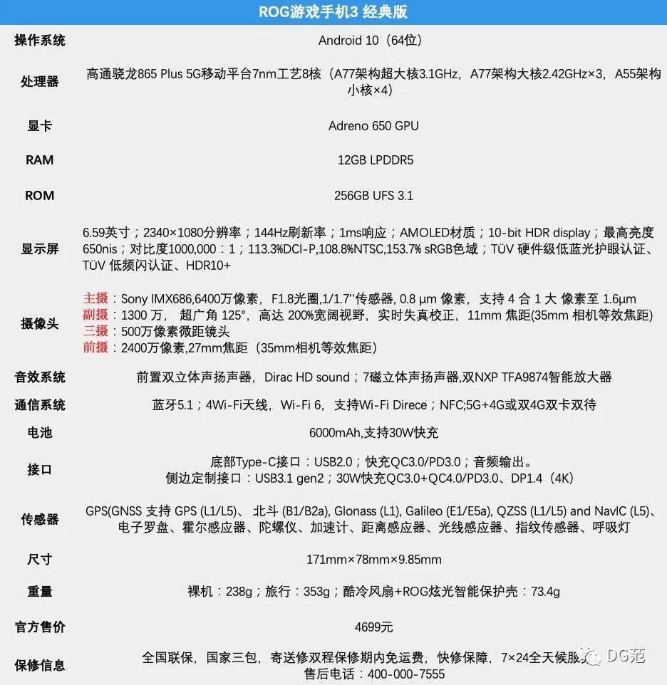 笔者拿到的这款是ROG游戏手机3经典版(12GB+256GB),搭载骁龙865 Plus 5G平台,12GB LPDDR5 RAM以及256GB UFS3.1 ROM,屏幕为6.59英寸AMOLED电竞屏,更多参数可参考下表: