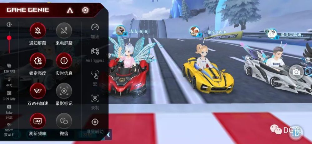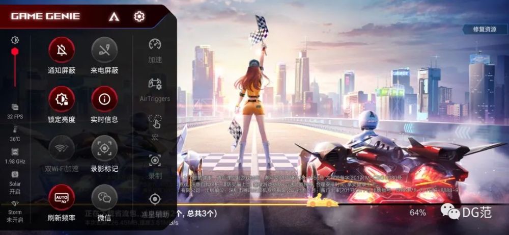 启动游戏过程中会显示游戏精灵自动优化项,游戏启动后左侧可划出游戏精灵控制面板。通过控制面板,可以快速进入智控中心、屏蔽通知、屏蔽来电、锁定屏幕亮度、实时显示硬件信息(CPU/GPU使用率、系统温度、FPS等)、双Wi-Fi加速、录影标记、切换屏幕刷新率(自动、60、90、120、144Hz)、打开微信小窗(QQ)、潜水模式、释放内存、开关和设置AirTriggers、宏(记录触控操作,播放后自动操作,可以自动刷野)、开启录屏、环场震感、准星辅助以及息屏挂机功能。