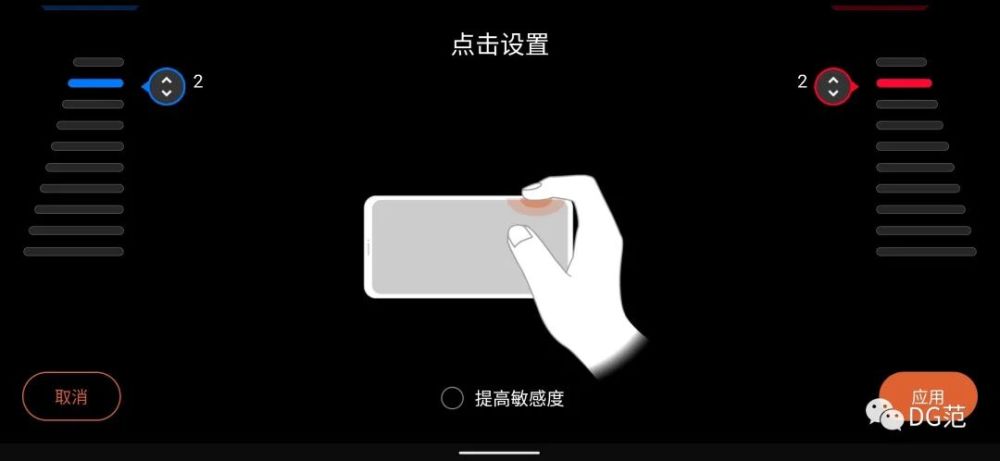 AirTriggers 2×2肩键可以在屏幕中设置对应的按压点以达到间接按压技能的效果。游戏界面左侧右划出“游戏精灵”,点击AirTriggers图标,左侧超声波肩键对应蓝色圆圈,右侧肩键对应红色圈,体感操作对应黄色圈。玩家可以根据自己的习惯在画面中拖动红蓝黄圆圈覆盖不同技能。肩键的触发面积、敏感度、触发速度等都可以自己设置。
