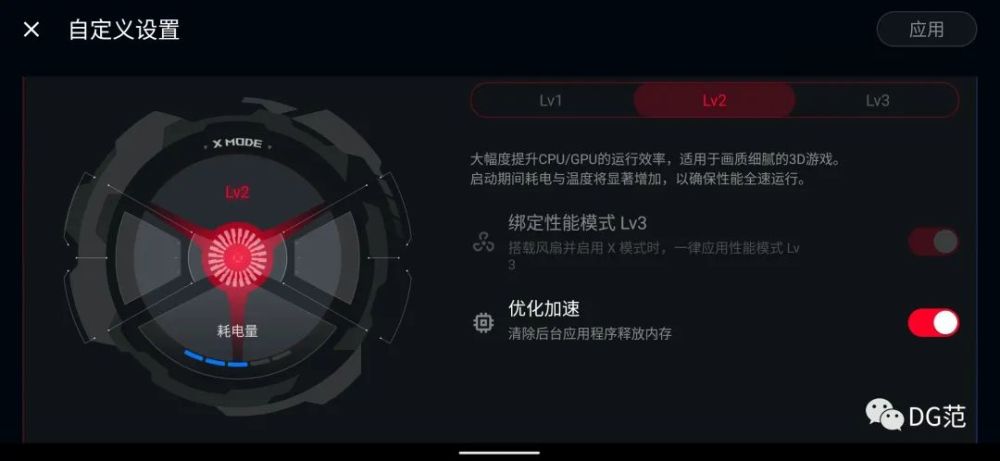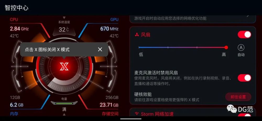 X模式共分为3级,每一级对应不同的CPU/GPU性能,其中前两级可以根据自己的使用需求随时调整,LV3需要酷冷风扇3的辅助才能开启。X模式的开启和关闭可以通过按压底边AirTriggers肩键实现快速切换,系统UI也会有相应的动画提示,简单快捷明了。