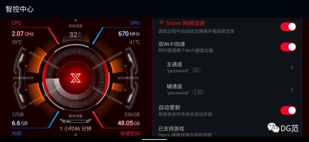 Storm网络加速,游戏过程中自动优化网络并提升稳定性,双Wi-Fi加速,5G和2.4G双通道加速。另外,ROG游戏手机3支持Wi-Fi 6技术,如果家里有Wi-Fi 6路由的话,网络速度会更快,延迟也更低。