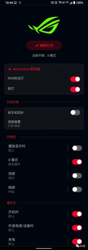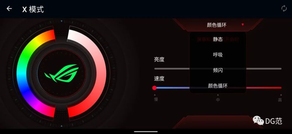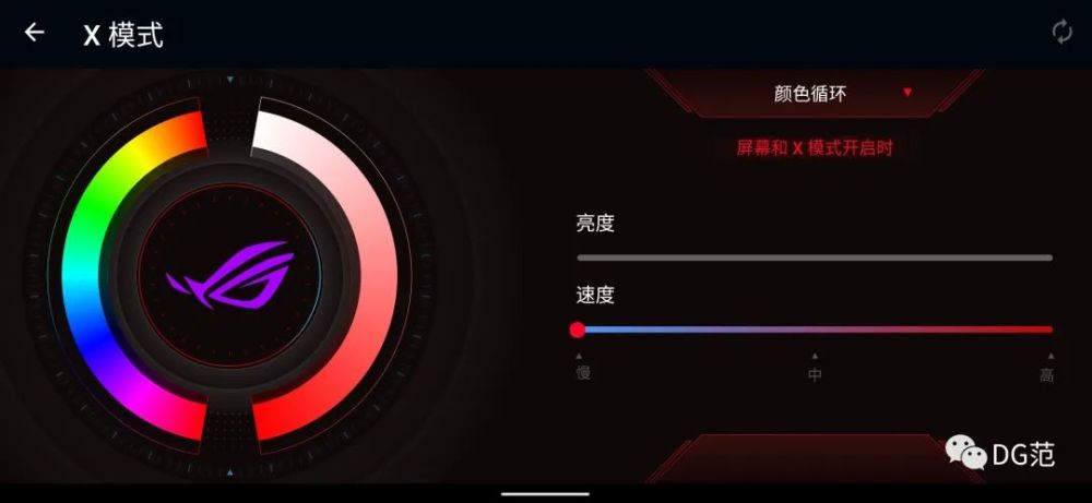 系统光可以控制RGB灯效,包括机身ROG logo及其他配件灯效,可以对颜色和灯光效果进行设置,还可以与其他ROG手机同步灯效。