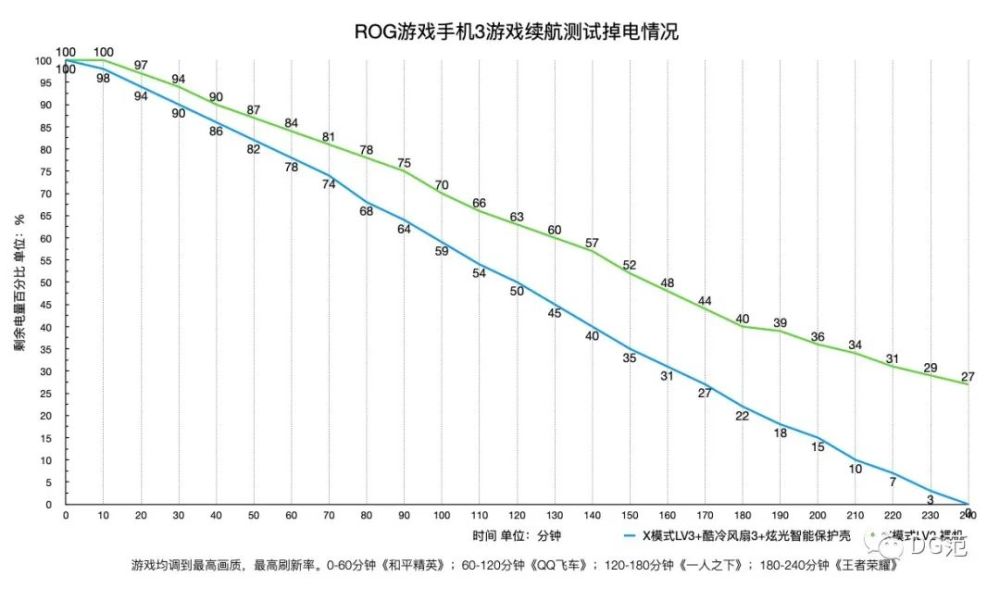 通过4个小时不间断游戏来测试ROG游戏手机3的续航能力,从上图中可以看出常规的性能模式下其续航能力较强,测试结束后依旧有27%的电量剩余。而极致性能模式下,耗电量明显增加,6000mAh的电池也没能扛到4个小时,不过也就差4分钟的时间。