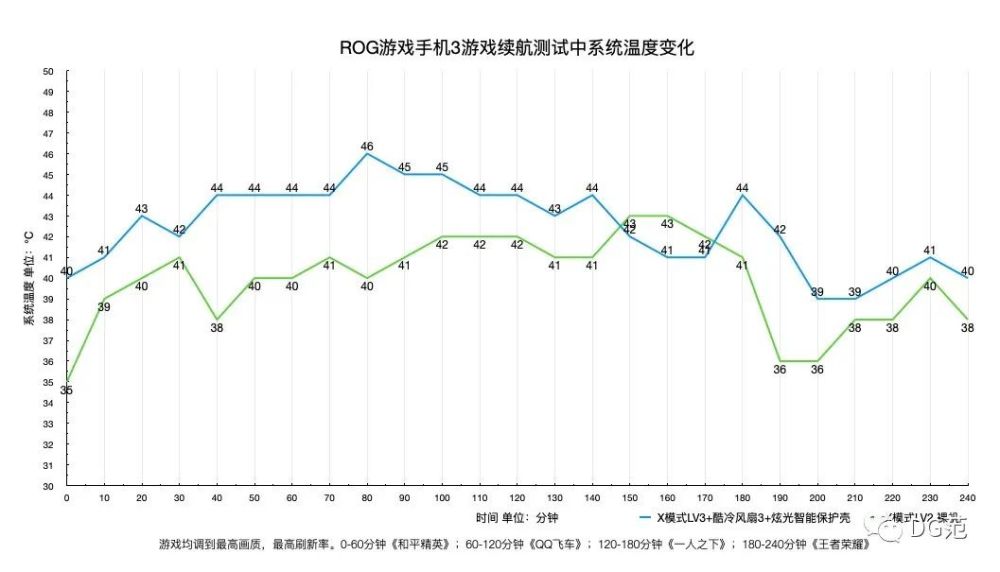 如此庞大复杂的散热系统让ROG游戏手机3在长时间运行大型手游的时候也能够保持足够的“冷静”,在续航测试时持续4个小时的游戏过程中,最高性能模式下的最高温度也没有超过46℃。