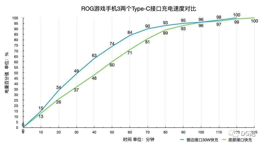 ROG游戏手机3提供了底部和侧边两个Type-C接口,均可用于充电,其中侧边接口最高支持30W快充。从上面的折线图不难看出实际充电中侧边接口的充电速度确实要比底部快,尤其是前90%的充电速度。但总体来看从0到100%所消耗的时间上二者相差不是很大,也就几分钟的差距。