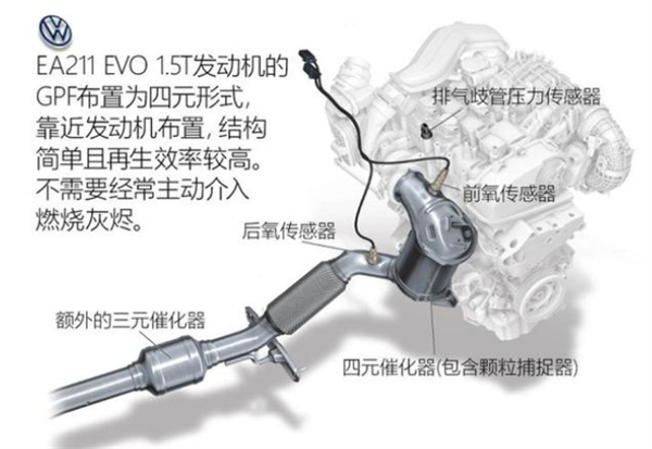 据悉, EA211 Evo发动机主要在GPF (汽油颗粒捕捉器)布局的变化,将GPF和三元催化器合二为一,结构更简单且捕捉效率更高,可以满足更严格的排放标准。