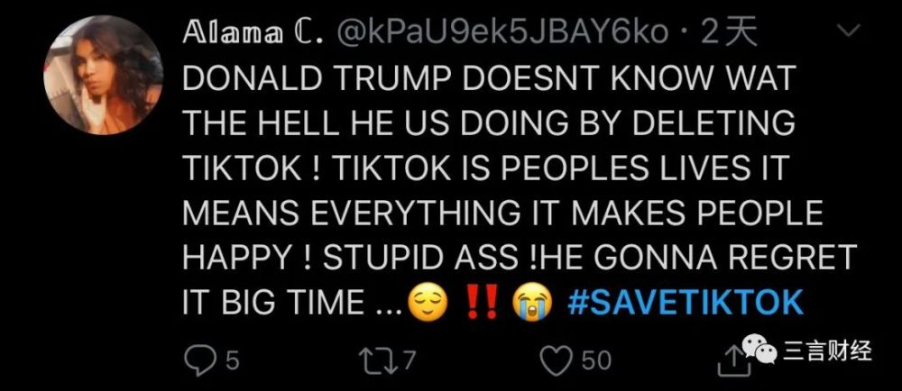 这些用户在社交平台建立了“#saveTikTok”(拯救TikTok)话题,发泄对特朗普这一行为的不满。