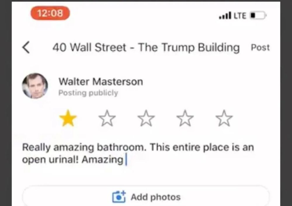 具体而言,就是通过谷歌地图给特朗普名下的酒店打一星评价。