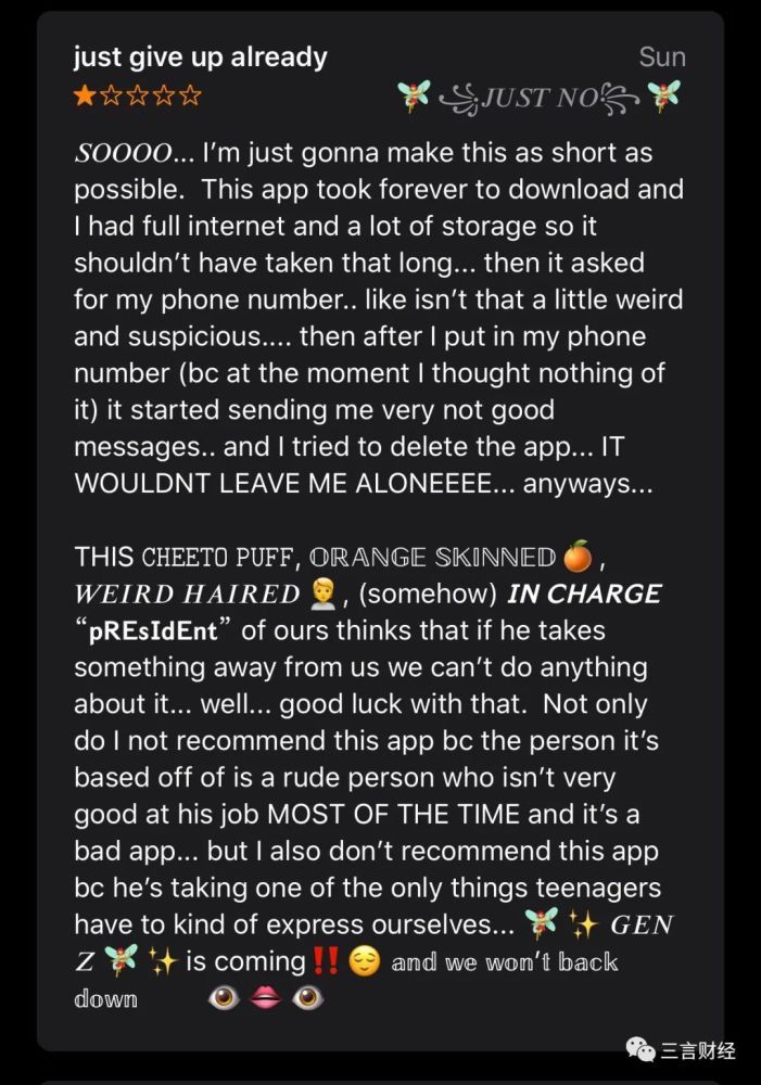 他还表示自己不推荐这款App是因为特朗普要禁止唯一一个年轻人能够表达自己的事物。