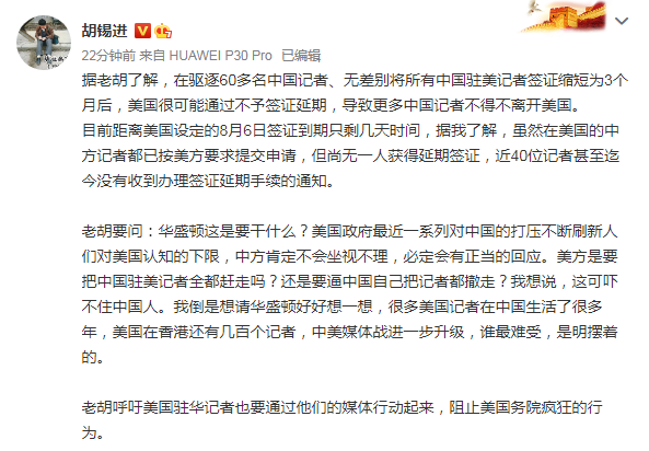 据老胡了解,在驱逐60多名中国记者,无差别将所有中国驻美记者签证缩短为3个月后,美国很可能通过不予签证延期,导致更多中国记者不得不离开美国。