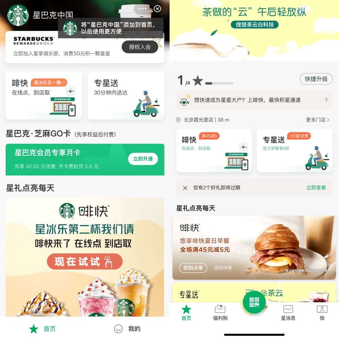 左:支付宝中星巴克入口 右:星巴克App截图 (均无拼单入口)