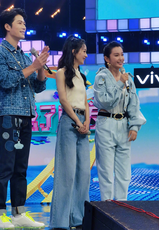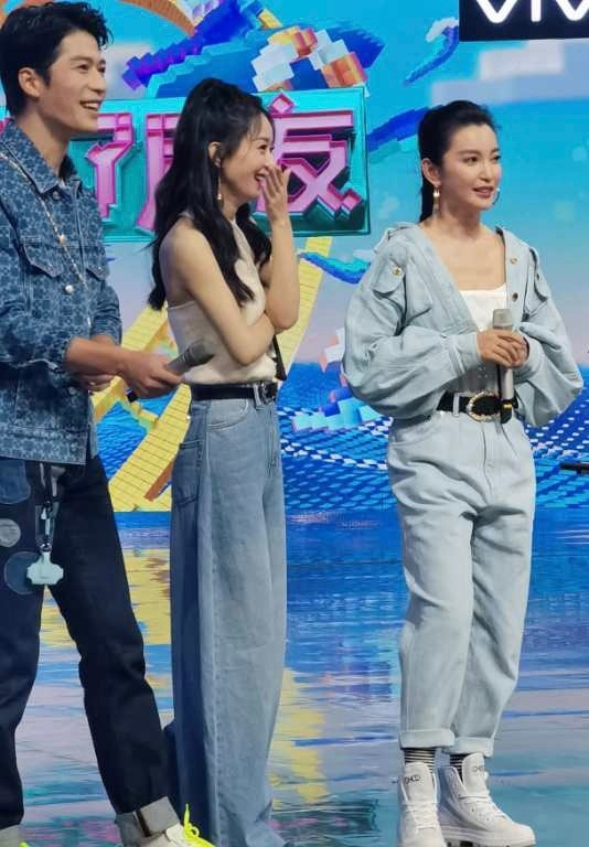 录制当天赵丽颖穿着白色露肩上衣搭配阔腿牛仔裤,李冰冰连体牛仔衣加内搭低领吊带,两人一同拉高了《快本》现场的颜值线。王一博则是照常的休闲穿搭,衬衫配内搭T恤,彰显青春活力。
