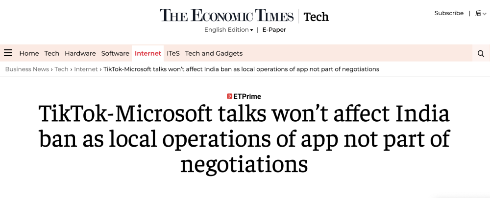 据印度《经济时报》4日报道,一位知情的印度政府高级官员表示,微软谈判收购TikTok美国业务,不会影响TikTok在印度面临的禁令,因为上述收购谈判并不包含本土运营内容。
