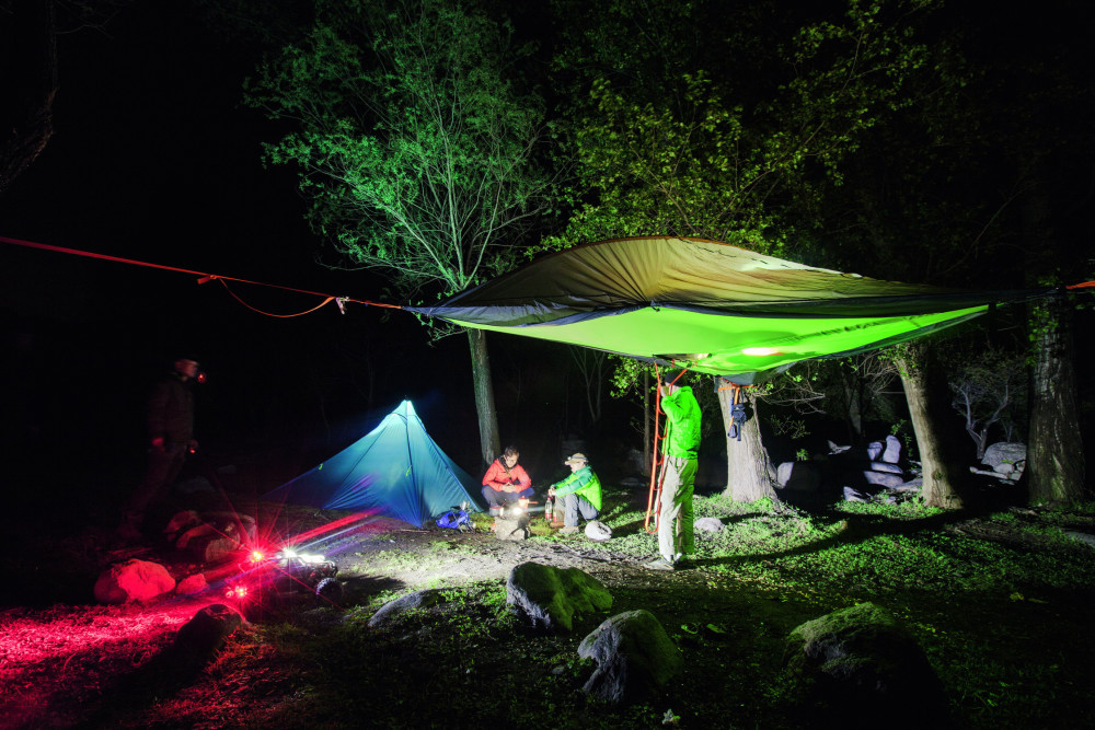 搭几顶帐篷对于我们这些有户外经验的老驴来说就是小菜一碟,但一套新装备却让我们忙出了一头汗——朋友新买了一顶树帐。虽然我是“老驴”,但对于这个“悬浮”在半空中的帐篷,确实没有话语权,只能按着说明书一步一步操作。好在哥儿几个心灵手巧,最终还是把树帐搭了起来。树帐的底部中央有一个门,其中存放着软梯,人可以通过它爬到树帐里,就像秘密基地一样,非常有趣。为了表示谢意,这位晚上要爬上软梯住树帐的朋友为我们忙活起晚饭来,凉菜、烧烤、零食、饮料一个都不少。