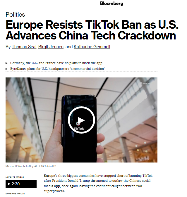 彭博社报道:美国加大力度打压中国科技的同时,欧洲抵制TikTok禁令