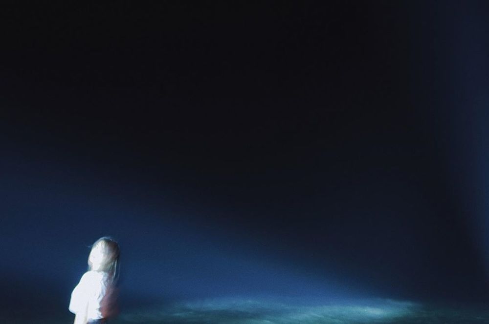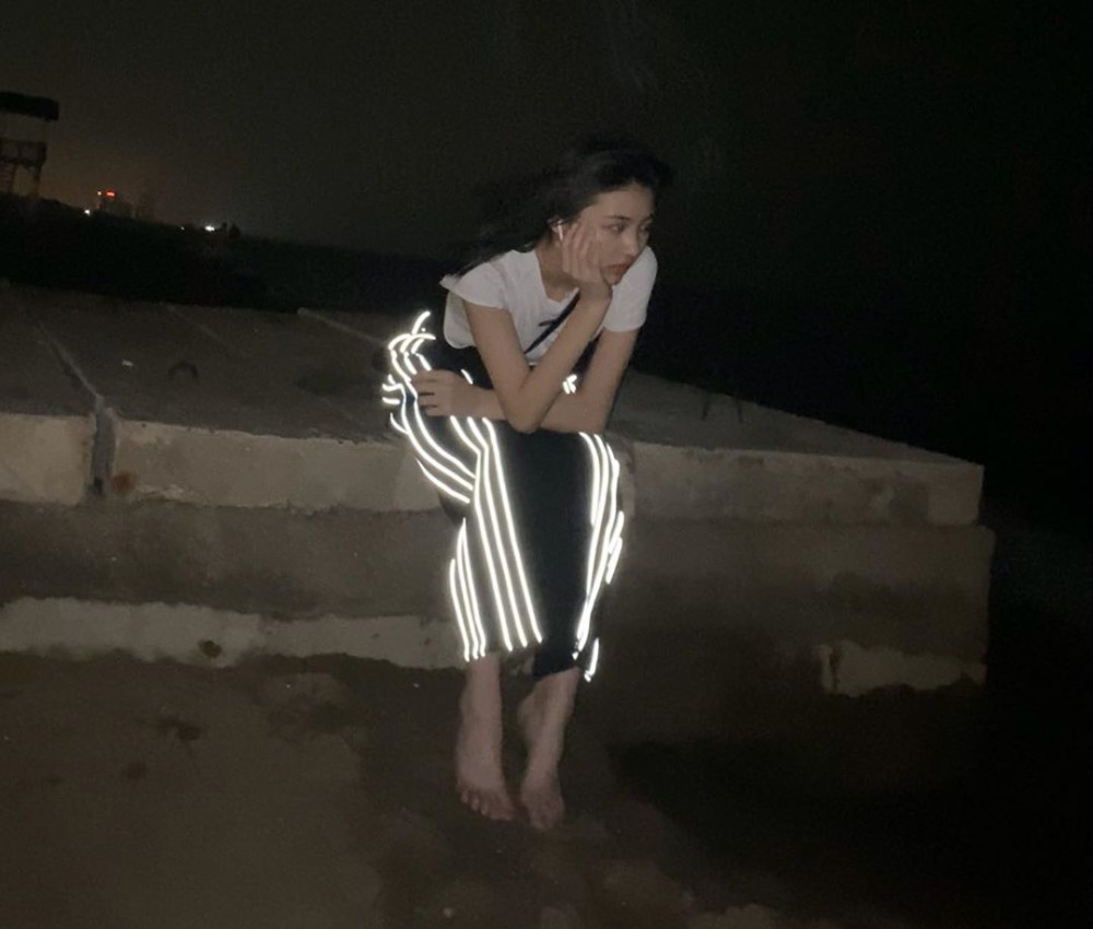 另外一张照片中,小苹果站在黑暗之中,摆出回头的pose,虽然人脸过曝,但整体意境却非常唯美。