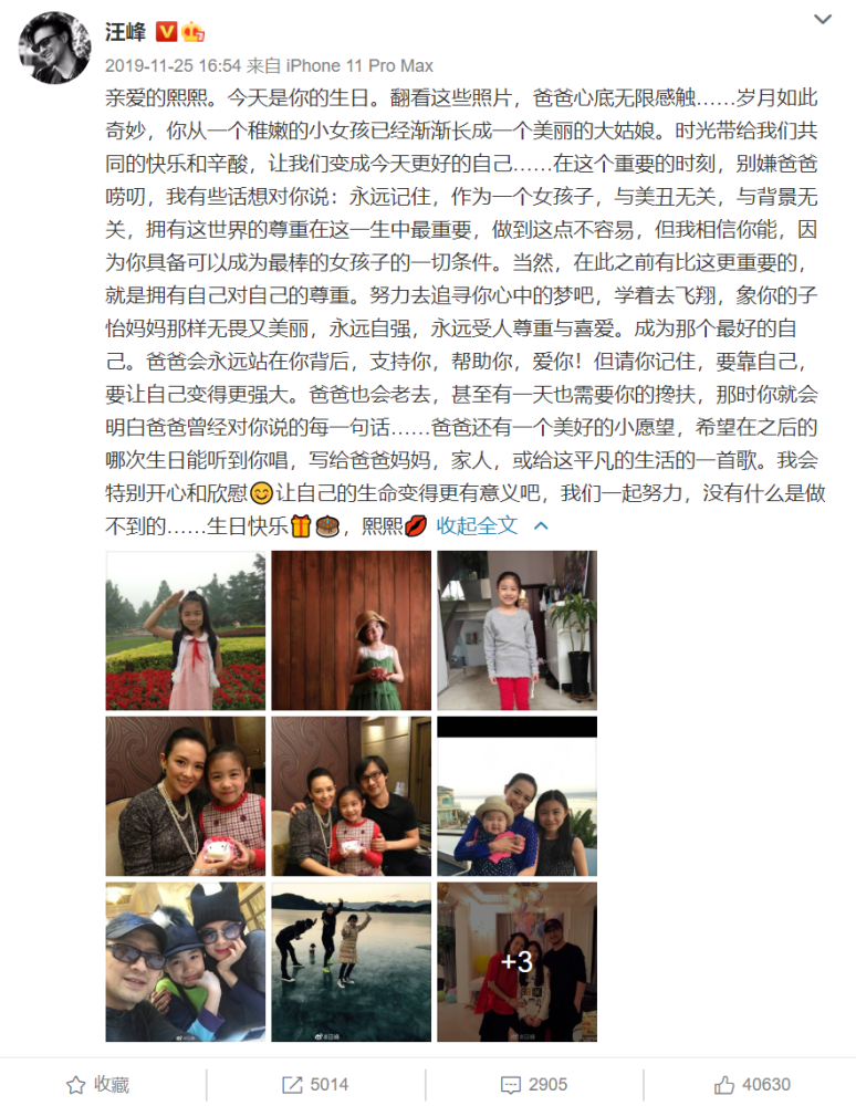 幸运的是,小苹果大部分时间是和汪峰章子怡以及奶奶生活在一起。而且,汪峰对女儿的教育方式也是严格加慈爱,早在小苹果14岁生日之际,汪峰曾在微博上发布长文,送祝福的同时,也表达了对女儿的嘱托和叮咛:“永远记住,作为一个女孩子,与美丑无关,与背景无关,拥有这世界的尊重在这一生中最重要,做到这点不容易,但我相信你能,因为你具备可以成为最棒的女孩子的一切条件。当然,在此之前有比这更重要的,就是拥有自己对自己的尊重。”