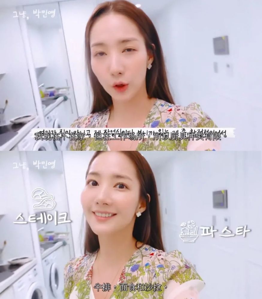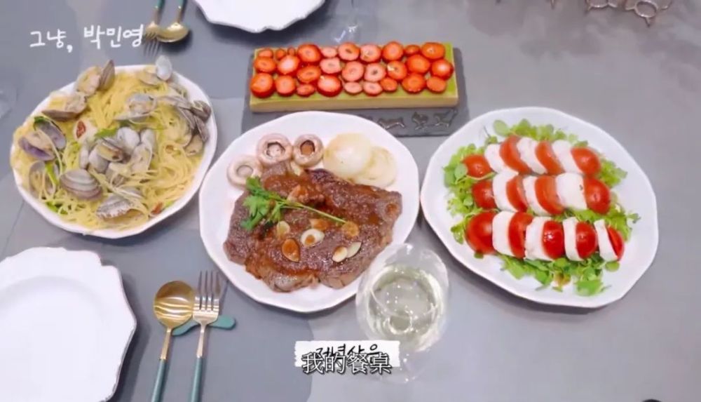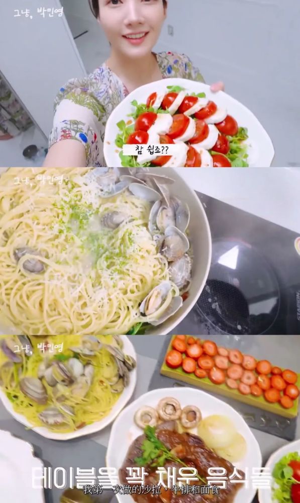 就算是一个人录制,边做边讲解也完全没有影响餐品质量。不论是沙拉、意面还是牛排全都色香俱全的样子,真的很想去欧尼家蹭饭了!