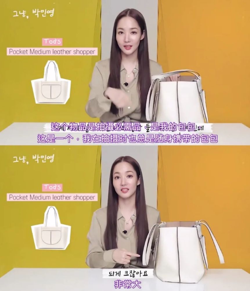 女明星的包包里有什么?首先咱们的关注点必须得是包!作为Tod’s韩国品牌大使,敏英欧尼对自己手里这只通勤Tod’s可以说是评价非常高了——“非常大”!