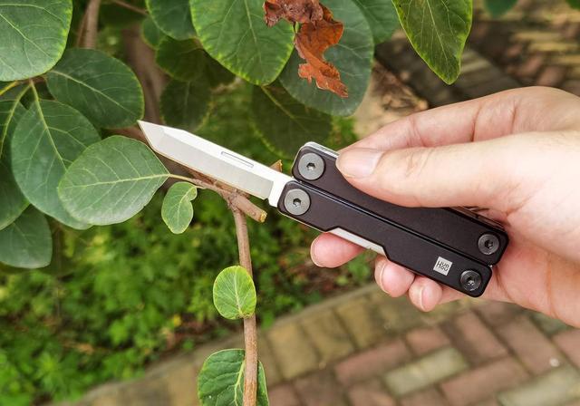 火候mini多功能刀共有十一种功能器械,先来看主刀,刀具形体有点类似唐刀的切刃,美感性不错。火候本身就是专业的刀具品牌,这个多功能刀也是继承了其刀具的锋利度,日常削个水果还是很轻松的。