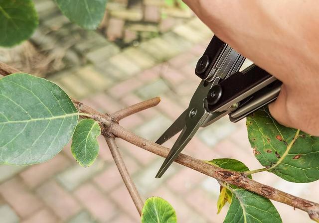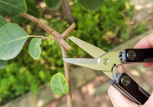 手柄翻折之后就是一个大剪刀,它有一个力学结构,在剪下之后会自动张开,好用又很省力。这个剪刀同样很锋利,剪树枝都没有崩刃,用起来很趁手,像剪纸、剪布料就更不在话下。