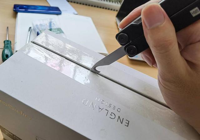 另一侧手柄的器械有点像割绳刀,不过它的前端还有一个小开刃,在这里是当作开箱器使用。顶端开刃用来刺破胶带,镰刀型刀尖可以深入一部分,方便顺畅的划开胶带,同时还不会划破箱子里的物品。