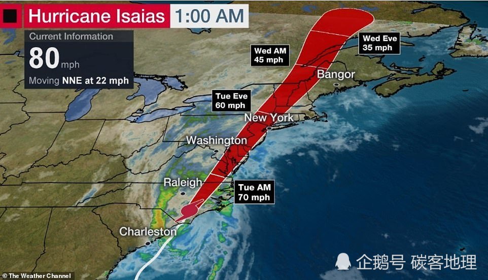 据美国媒体8月4日报道,周二(8月4日)午夜,“以赛亚斯”(Isaias)飓风在北卡罗来纳州和南卡罗来纳州分开的边境附近登陆,成为1级飓风,阵风高达80英里/小时(128公里/小时),带来“威胁生命的洪水”和龙卷风;纽约市也正准备迎接2012年“桑迪”飓风以来的最大风暴。