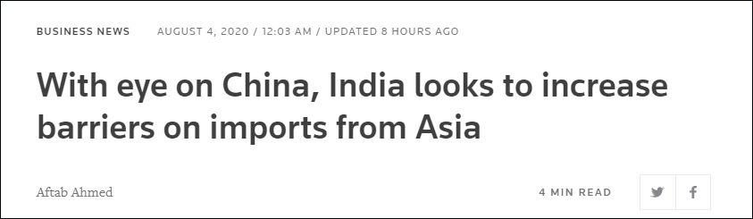 【文/观察者网 齐倩】被反华情绪冲昏头脑的印度政府又出“新招”,这次针对的依旧是对华贸易。据路透社8月4日报道,两名印度政府消息人士表示,印度政府正在考虑采取措施,防止亚洲,特别是东南亚的贸易伙伴将中国商品转运至印度。