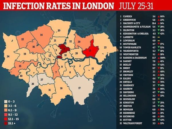 中新社·华舆讯 据英中眼报道 今天,首相发言人在唐宁街的例行记者会上表示,一旦英国的每日新增病例激增,不排除再次对伦敦实施封城的计划,不料遭到伦敦市长萨迪克 汗的强烈反对。另一方面,大曼彻斯特政府宣布启动疫情“重大事件”,为了更好地帮助各机构“尽可能有效地”做出反应,包括动用军队和额外的资金等。