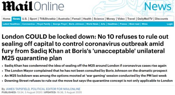 在一封写给鲍里斯的公开信中,萨迪克 汗惊讶地说:“上周日,我们从报纸上获悉,英国政府举行了一次针对伦敦二次疫情的规划会议,可能的应对措施包括以M25为界,对大伦敦实施封锁。”