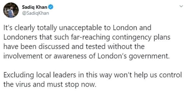 “让我们惊讶的是,如此深远的应急计划是在伦敦政府不参与或不知情的情况下进行的。这显然是完全不可接受的,是对伦敦和伦敦人的侮辱。”