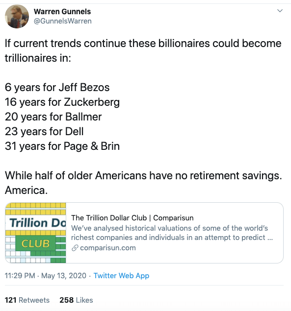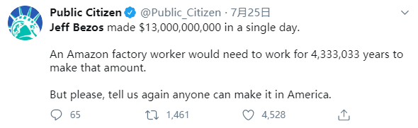 “杰夫·贝佐斯一天就赚了130亿美元。一个亚马逊的工厂工人需要工作4333033年才能挣到这个数目。但是,请再次告诉我们,任何人都可以在美国成功。”