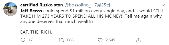 “即使杰夫·贝佐斯每天花100万美元,他也要273年才能花光所有的钱!! 再告诉我一遍为什么有人值得拥有那么多财富?”