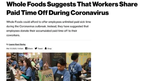 疫情期间亚马逊旗下生鲜连锁超市WholeFoods在内部邮件中宣布为确诊感染员工提供两周带薪假,同时又暗示员工可以捐出自己的带薪病假分给被病毒感染的同事。