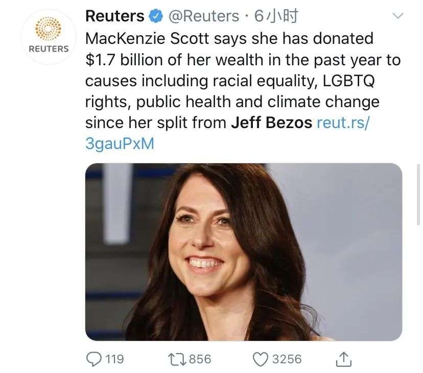 7月28日麦肯齐对外表示,自与贝佐斯分手后,她在过去一年中已经将财富中的17亿美元捐赠给了各种慈善组织,包括种族平等,LGBTQ平权,公共卫生和气候变化等。