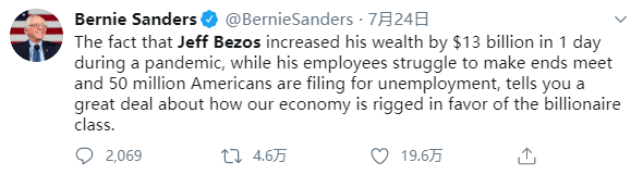 曾参与总统竞选的桑德斯推特称:在疫情期间,杰夫·贝佐斯的财富一天内增加了130亿美元,而他的员工却在努力维持生计,5000万美国人正在申请失业,很明显,我们的经济就是这样被操纵以利于亿万富翁阶层的。