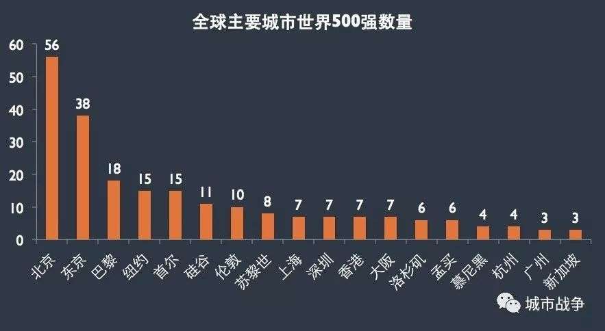 不仅如此,北京还是全球世界500强企业最多的城市,拥有56家世界500强企业,吊打纽约、伦敦和东京。相比而言,上海7家,深圳7家,广州3家。
