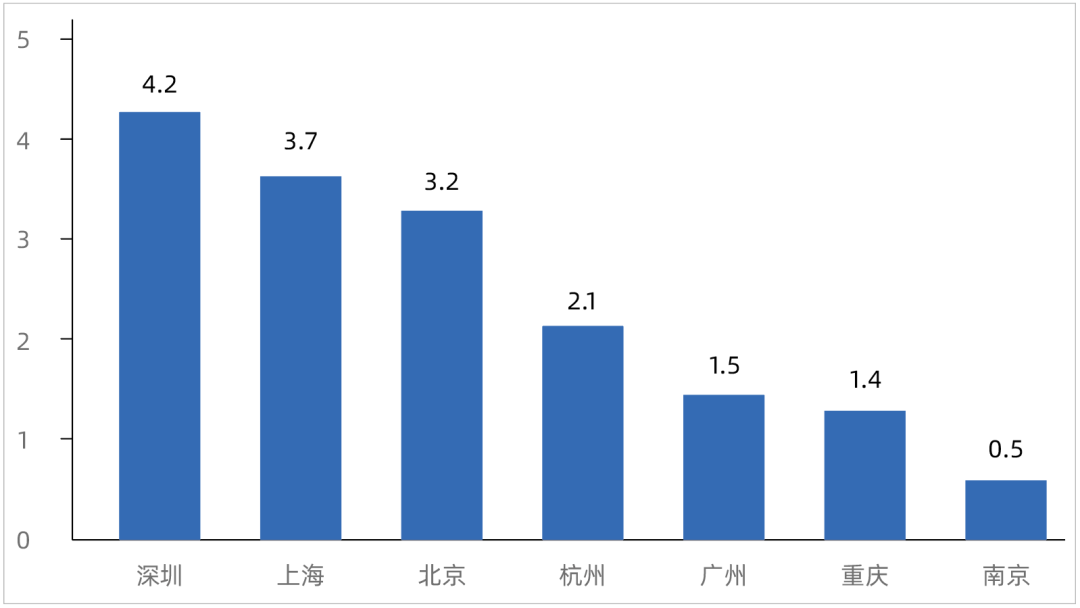 杭州、南京、重庆为第三档,平均租金为3.29元/㎡/天,相当于沪穗深的1/2。