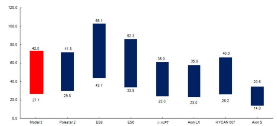 ▲图2 国内主要新能源车型补贴后价格区间(单位:万元人民币)资料来源:汽车之家,国信证券