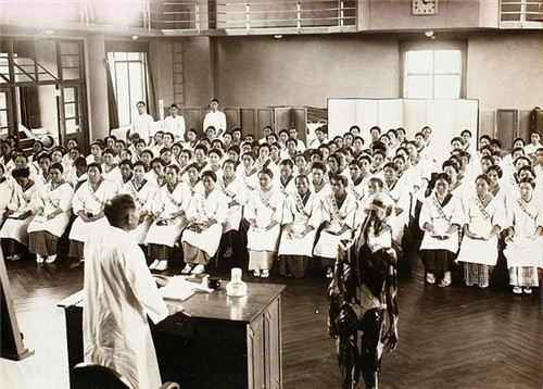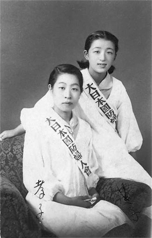 上图为日本国防妇人会,上文曾提到过一个自杀的新婚妻子,那人叫井上千代子,时年22岁。没想到的是,割腕自杀的她却成了日本人的榜样,安田夫人一手促成了国防妇人会,鼓励妇女支持侵略战争。