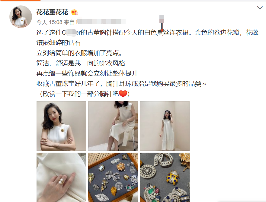 8月7日,总裁夫人董花花在社交平台秀出部分收藏品,称自己很喜欢古董珠宝,已经收藏好几年了。她言语中透露出浓浓的自信与优越感,令人羡慕不已。