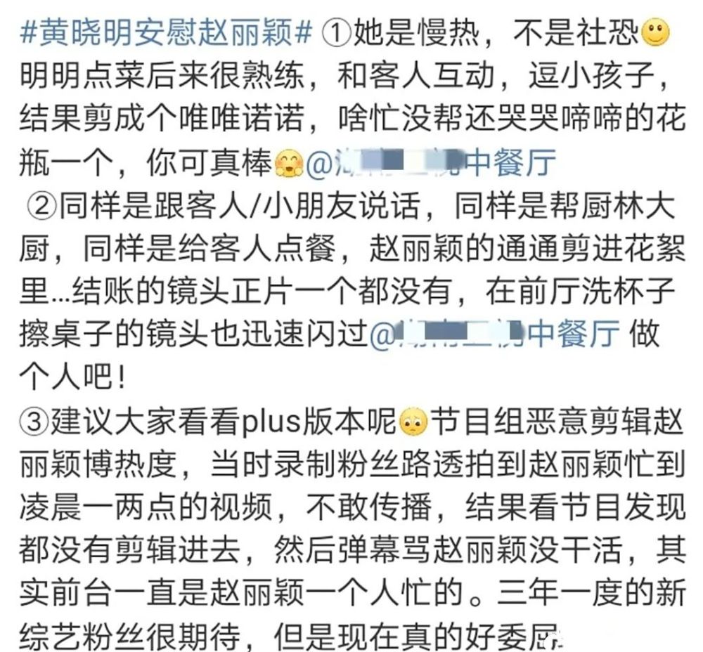 这一处的剪辑与客人离开后大家都开始收拾桌子,在后厨刷碗如出一辙。所有人都在忙前忙后又唯独不见赵丽颖,再一次将她塑造成不干活的样子。