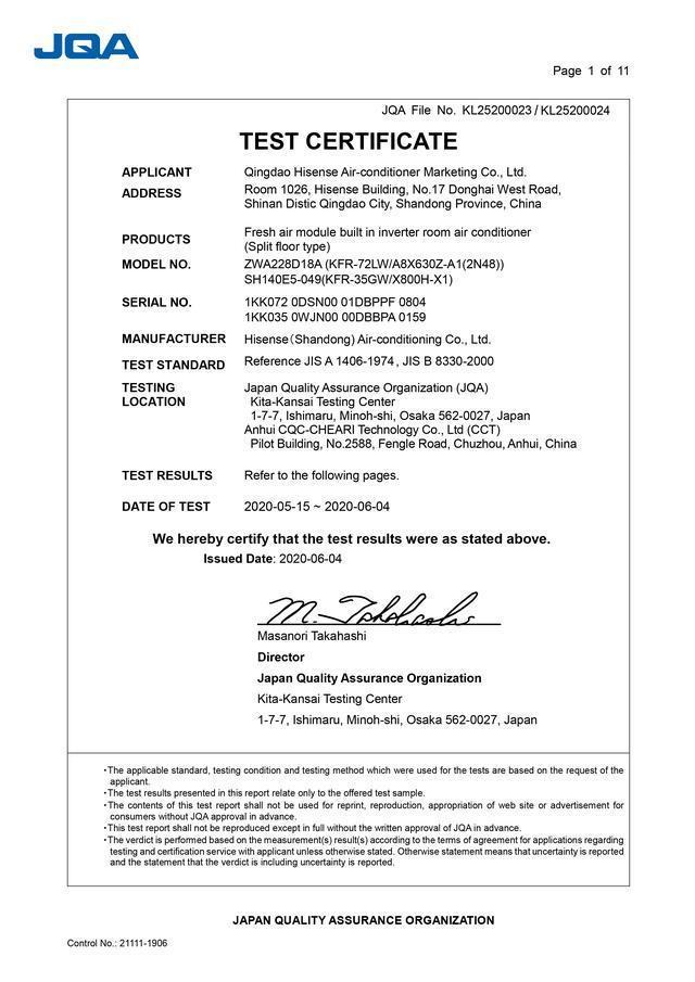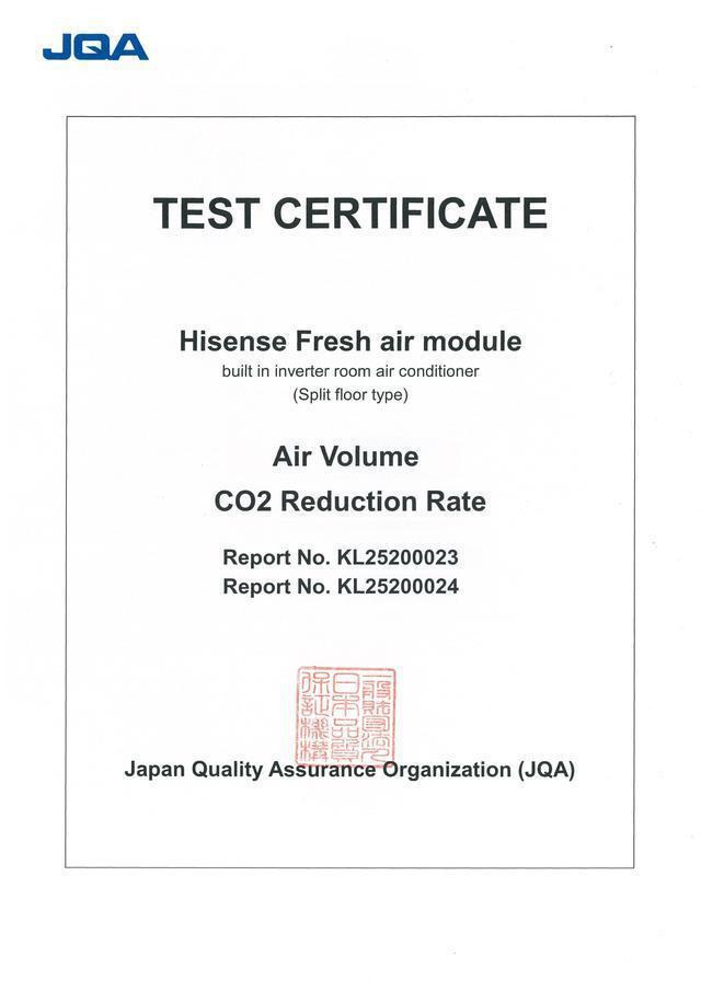 据海信官方表示,旗下的新风空调通过日本大阪Kita-Kansai测试中心测试,根据JQA(日本质量保证协会)出具的测试证书显示,海信新风空调的新风系统额定风量达到每小时90立方米,符合日本质量检测标准。