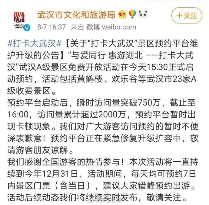 武汉23家A级景区免门票 【“免费游武汉”昨天太火爆没约上?今早8点来这里(附预约入口)】武汉市昨天宣布全市23家A级景区将面向武汉市民和全国游客免费开放,但也有许多没预约上的网友都在着急地问“为啥我卡在最后一步了?”“我还有机会吗?”小编刚才尝试访问预约平台,目前已经可以顺利进入预约页面,早上8点将开启今天的预约。 (长江日报)
