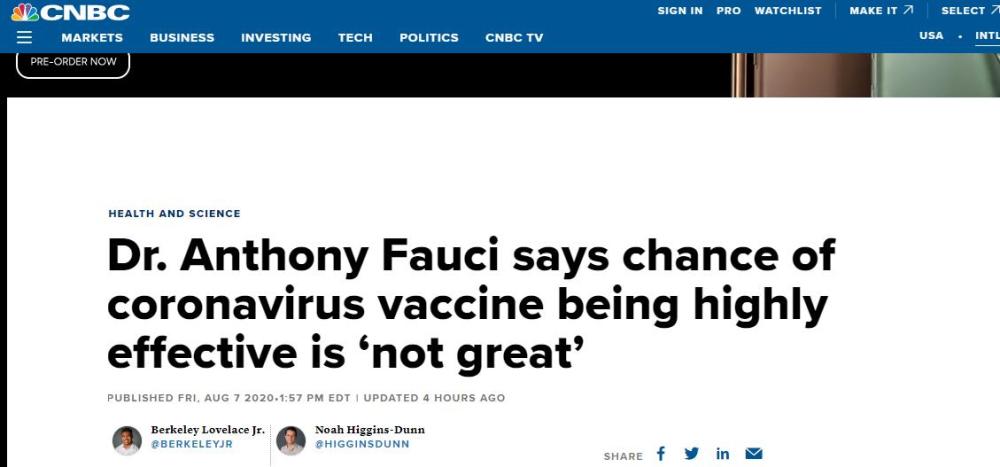 CNBC称,福奇的一些言论与美国总统特朗普存在分歧,特朗普曾在多个公开场合表示,新冠病毒最终将会消失。关于疫苗,特朗普似乎也颇为乐观。在6日的采访时,特朗普称,美国有可能在11月3日大选前研制出新冠疫苗。