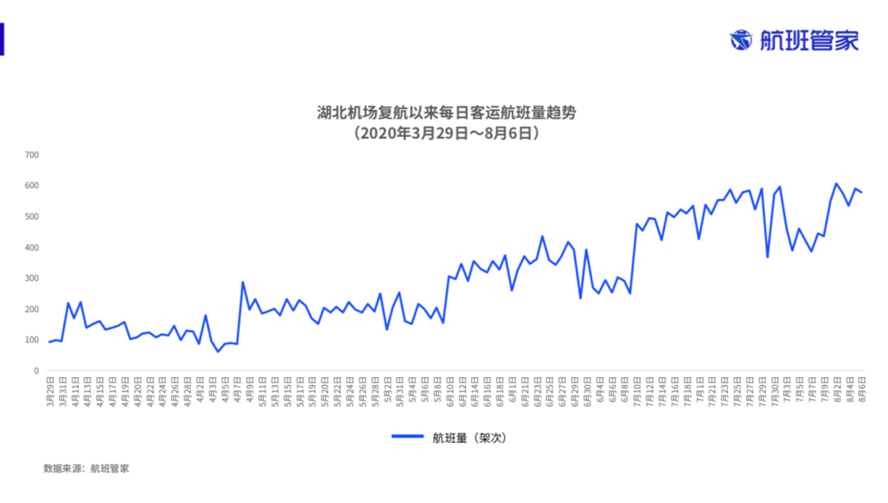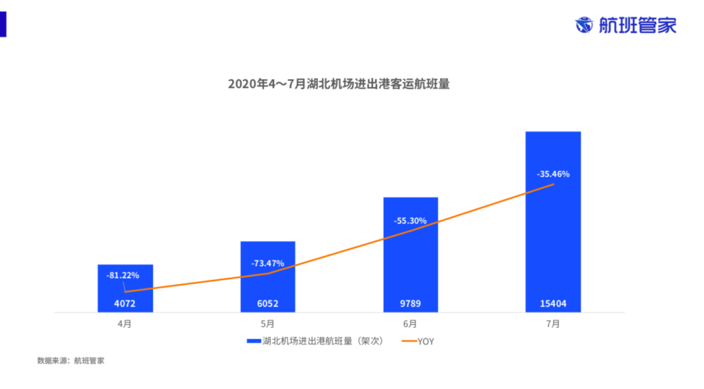 湖北机场的航班架次也在逐步恢复。今年4月8日,武汉机场率先复航,此后湖北6个机场陆续复航。据航班管家统计,今年4月,湖北各机场进出港客运航班量同比去年降幅高达81.22%;至7月,航班量同比降幅已缩小至35.46%,进港航班主要来自成都、昆明、深圳、上海、广州、重庆等城市。