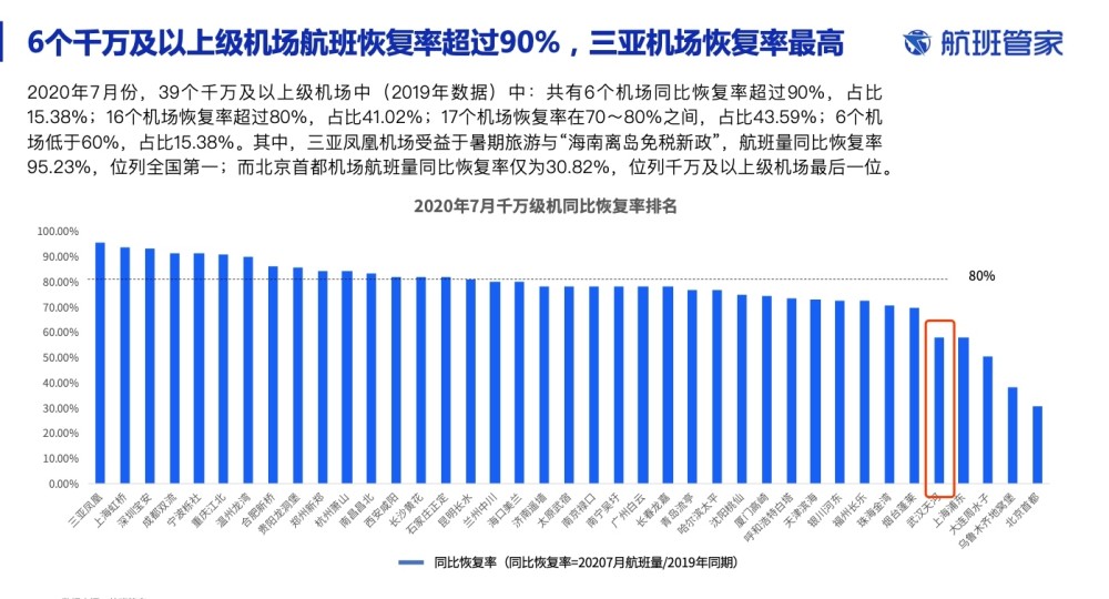 不过,在全国39个千万级机场中,武汉天河机场的恢复率目前排名仍然比较靠后。而三亚凤凰机场、上海虹桥机场、深圳宝安机场、成都双流机场等,因为所在地疫情防控较早放宽,恢复情况更好一些。
