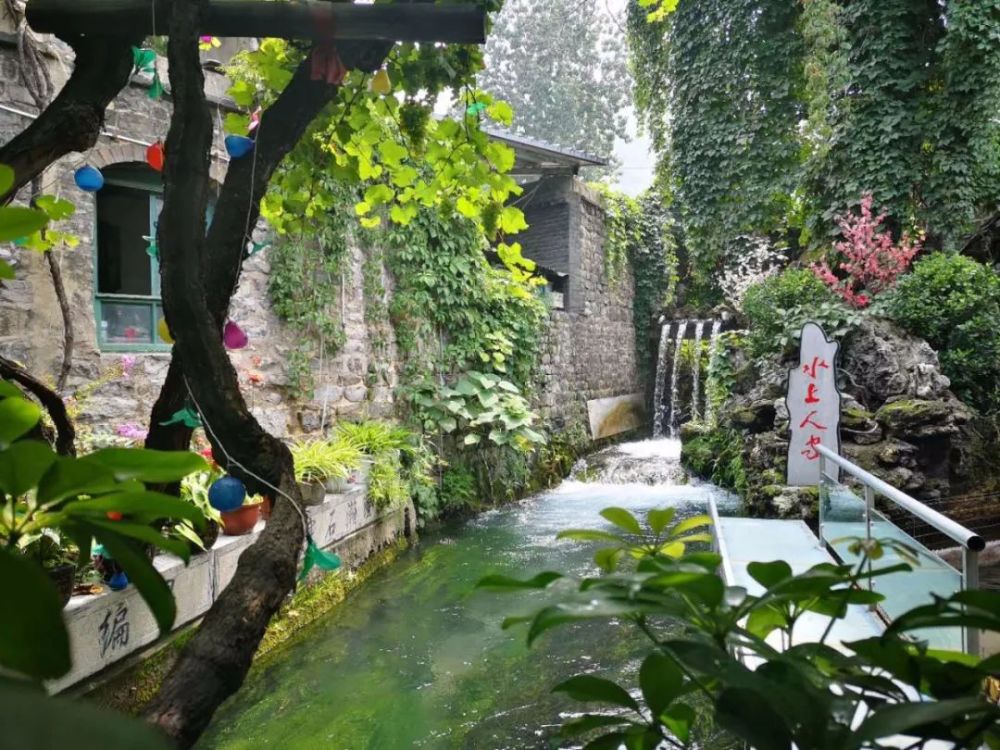 水上人家流域面积较大,泉水经过近百户人家,其中葡萄树院是最具有代表性的一家,一进院门,咕嘟泉从院中流过,院内有一棵几十年树龄的葡萄树,枝茎叶肥,主干长达3.5米,藤长20多米,每到夏天葡萄树把整个院子遮得严严实实,院内浓浓绿荫,脚下泉水潺潺,精致的石桌石椅,构成了小桥流水人家的农家情趣。