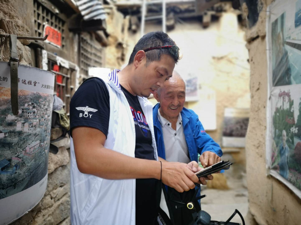 ▲国家导游大师牛刚与村民韩双牛老人交谈